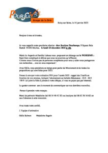- Lundi 10 janvier, à 14h, chez Anne-Marie : les addictions. Anne-Marie pense à une intervenante possible.